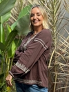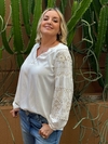 Com mangas amplas e bordados delicados, ela tem uma vibe boho sutil que combina com o jeans do dia a dia ou com aquela pantalona fluida pro final de semana. O decote com amarração e o tecido leve com listras discretas fazem dela uma daquelas peças que se destacam nos detalhes.