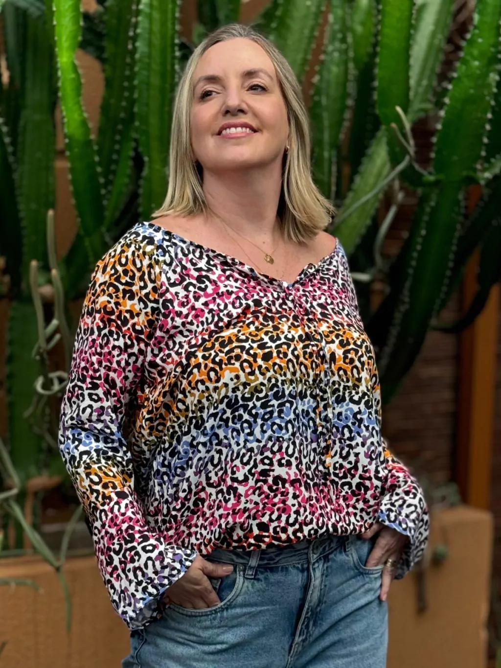 O design inclui decote em V com detalhe de amarração, adicionando um charme especial à peça. As mangas longas e soltas oferecem liberdade de movimento e elegância. Disponível em várias combinações de cores vibrantes e padrões de estampa, permite composições versáteis para diversas ocasiões, desde um encontro casual até um evento mais formal.