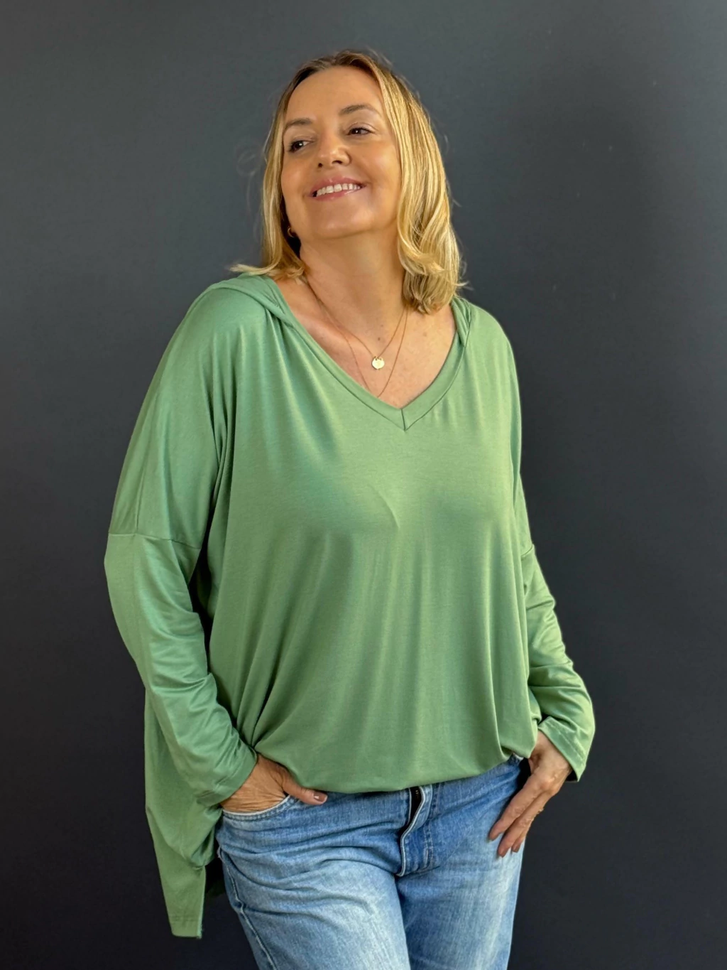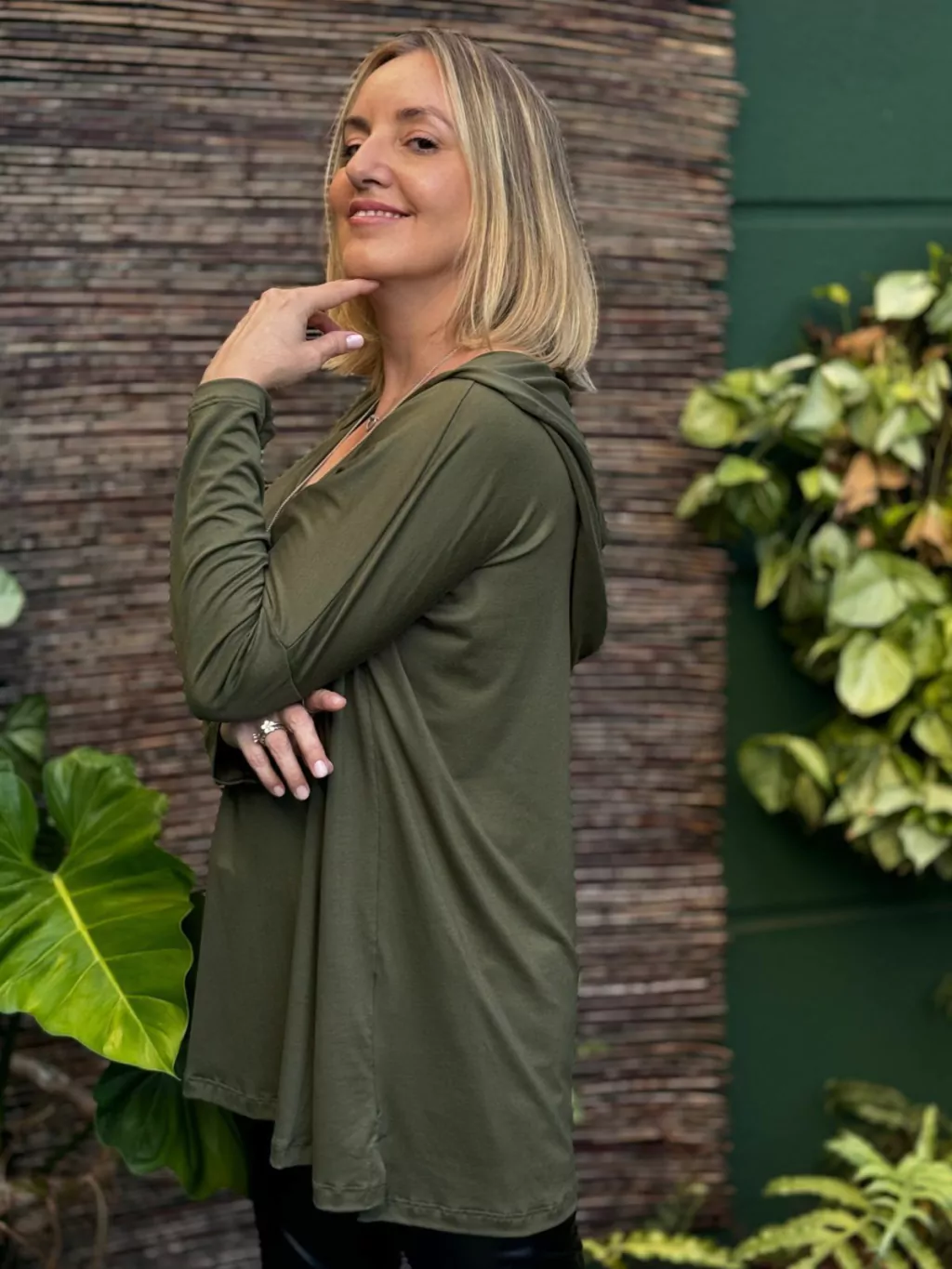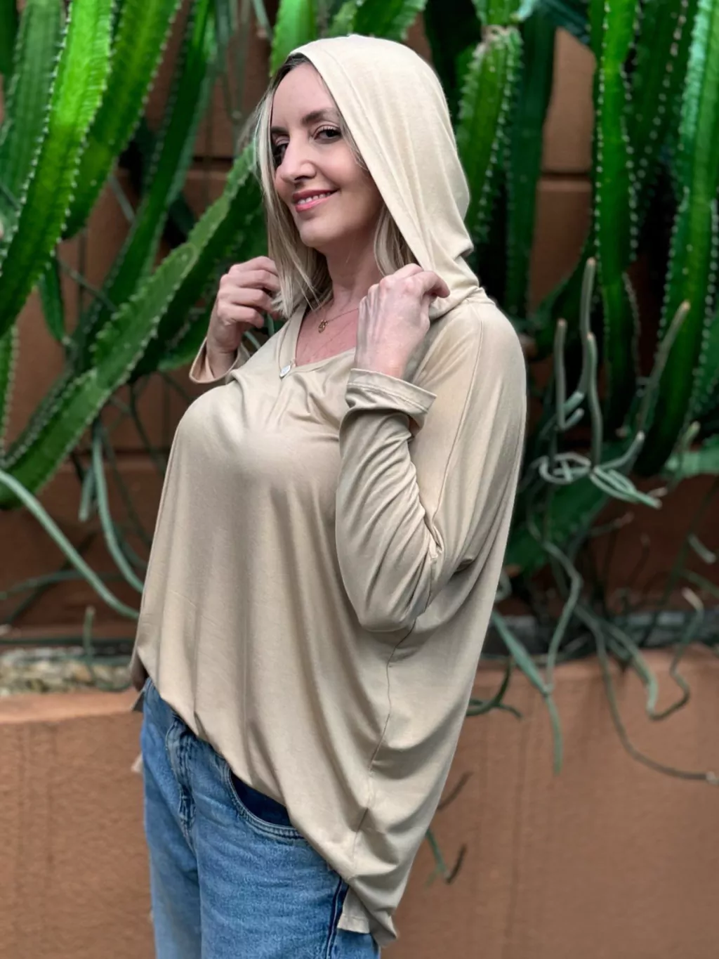 Ela tem um capuz que dá um toque casual e moderno, além de ser bem soltinha e confortável para usar.